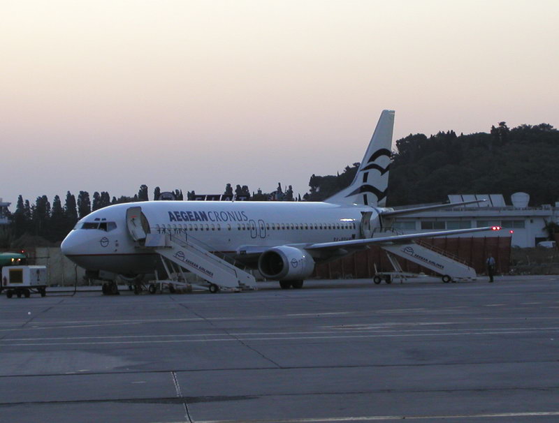 Weiter hinten im morgentlichem Grau eine Aegean B737-400.