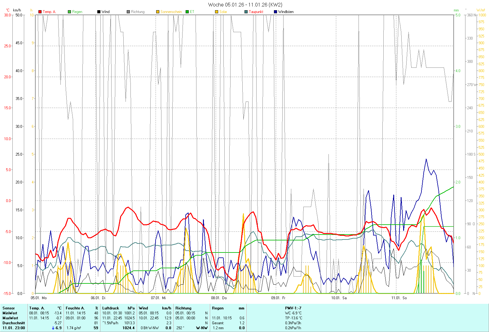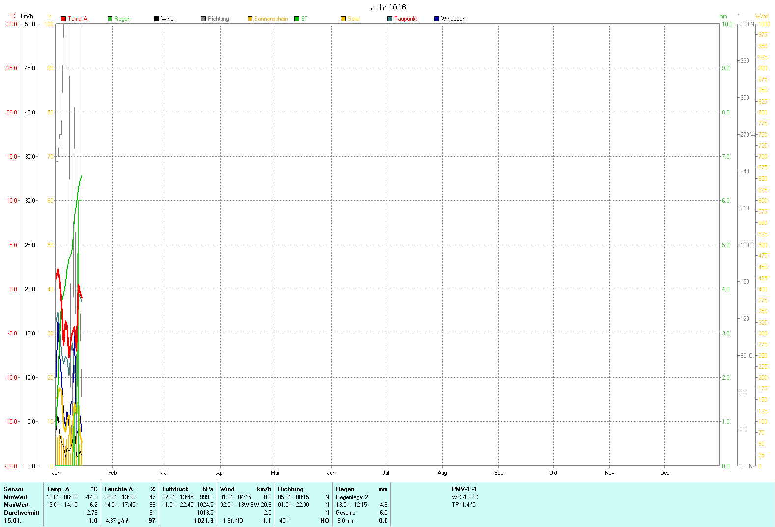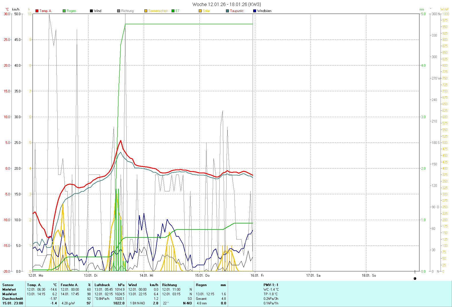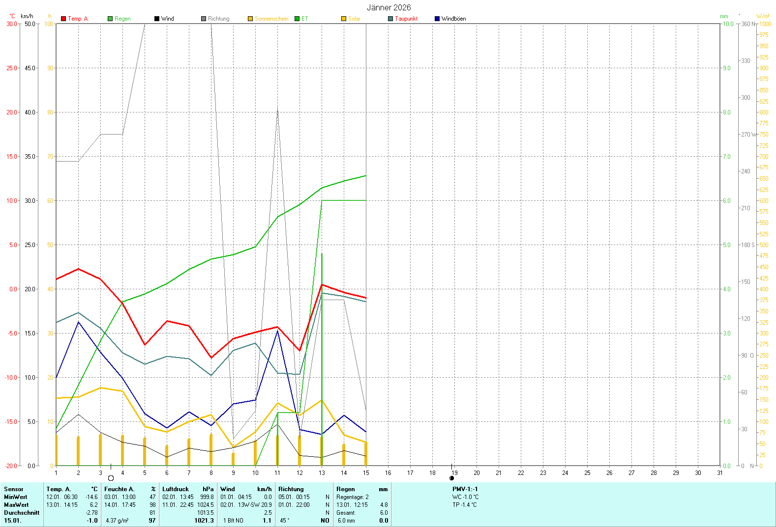 Der 1.1. war Nachmittags sonnig und abends wurde es bald wieder bewölkt. die Reste einer schwachen Front aus N/W brachten dann leichten Regen. Oberhalb der Inversionsschicht hatte es 10 Grad, bei uns blieb es im trüben zwischen -5 und -1 Grad. Am 5.1 gab es etwas Eisregen, die Temperaturen bei Nebel blieben um 0 Grad. Bis Mitte Jänner und darüber hinaus war Hochnebel / Inversion angesagt. Am 14. gab es etwas Schnee, der aber bald weg war, nachdem die Temperaturen einer frostigen Nacht bis -6 Grad wieder über 0 gestiegen waren. Ab 17.1. blieben die Temperaturen unter einer Hochnebeldecke durchgehend bei -3 Grad, oberhalb der Inversion waren es bis 6 Grad auf den Bergen westlich der Wachau. Ab 25. Jänner stiegen die Tageshöchstwerte wider gegen 5 Grad, es blieb aber beim Hochnebel. Gegen Ende des Jänner lockerte es dann immer wieder etwas auf. Nachts bei -2 Grad, Tags bis 6 Grad. Am 28.1. gab es sogar einmal 15 Grad. Für 2 Tage gab es dann Hochdruckwetter mit Sonnenschein. Die Nachttemperatur sank bis zum Morgen auf -8 Grad, tagsüber bis 7 Grad. Dann bewölkte es wieder und weiterhin trocken.