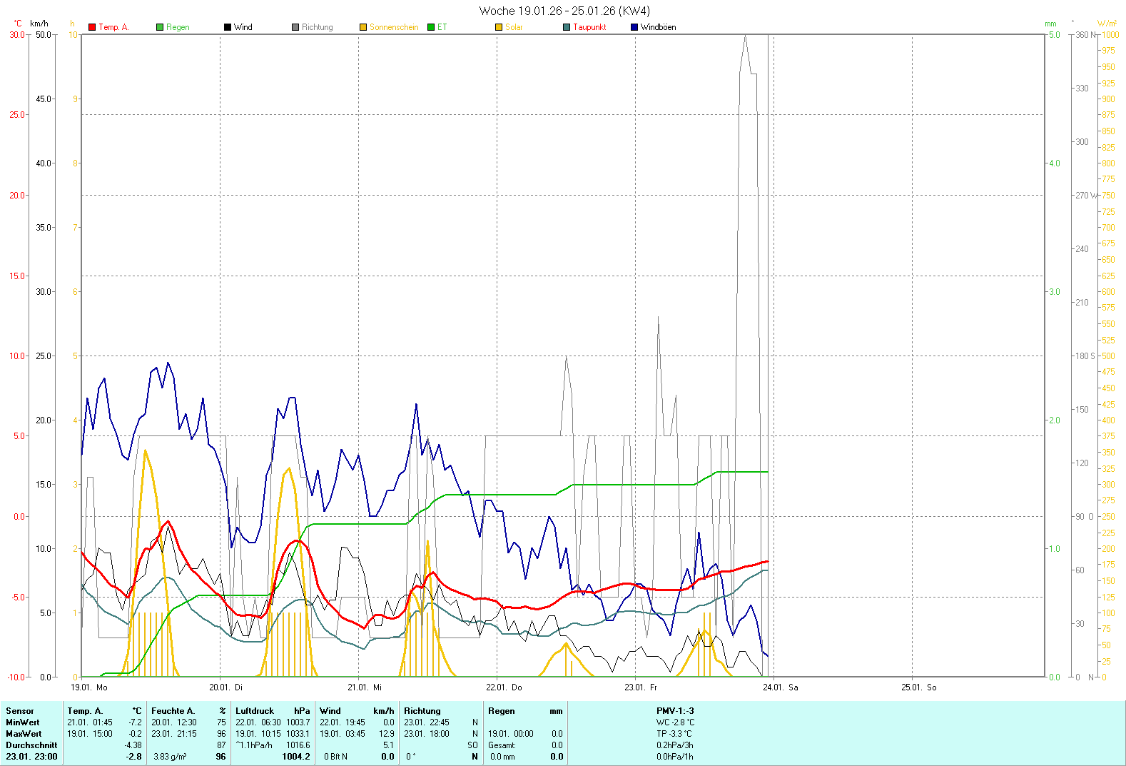 Anfang Dezember blieb es bei der Zweiteilung Europas: Im Norden bis hinunter Nord Spanien teilweise kalte, eisige Luft, und im Süden zu warme feuchte Luft, die teilweise große Schneemengen bringen. Hier im Übergang brachte das Regen/Eisregen und Schnee. Anfangs bei Temperaturen um die 0 Grad. Danach die bei mir gemessene bislang tiefste Temperatur mit -14,8 Grad. Die erste Woche war meist unter 0 Grad. Ein Woche nach dem Schneefall taute es, und es wurden dann 12mm an Regen gemessen. Danach wurde es wieder wärmer mit Temperaturen um die 5 Grad bis zu 11 Grad. Ein Hochdruckgebiet lies in relativ klareren Nächten die Temperaturen aber auf -2 Grad zu sinken. Unter Tags rechts Sonnig. In der 3. Woche kurz vor Weihnachten gab es dann viel Wind aus NordWest, was Wärme aber auch Regen bedeutete.