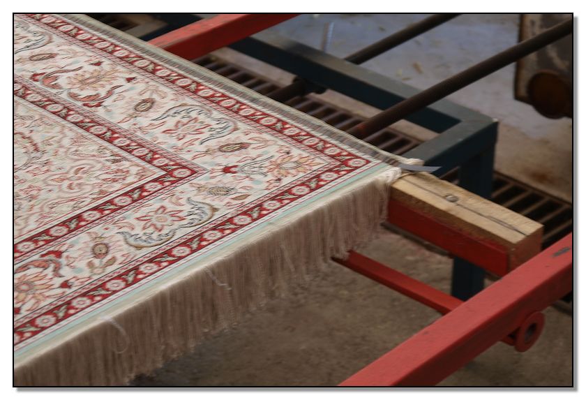 Die Teppiche werden über einige Zeit gespannt, damit sie plan werden.