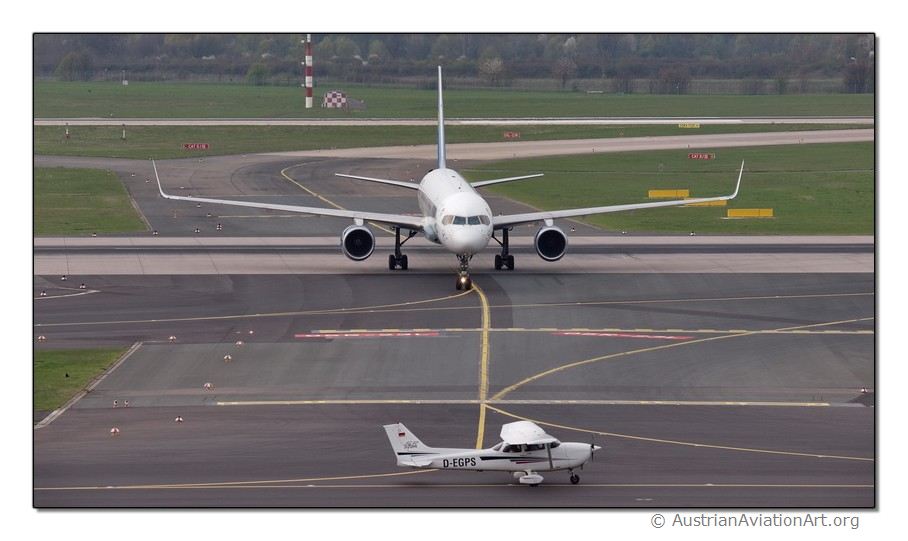 Schön wieder die Größenverhältnisse einer 4 sitzigen GA Maschine (Cessna 172) gegenüber der Spannweite eines Airliners (B757-300) zu sehen.