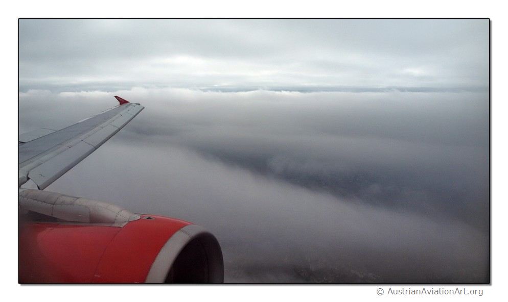 Sinkflug auf den Flughafen zwischen den Wolkenschichten