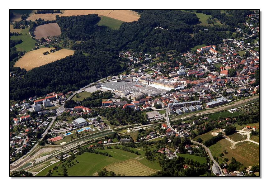 Aus der Luft zu sehen, das große Firmengelände von Laufen. Früher