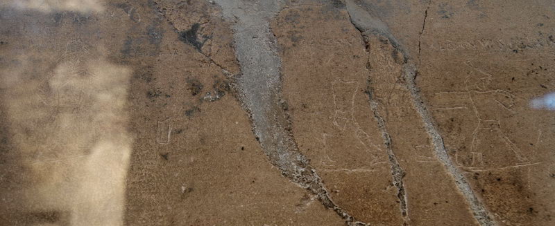 An einer Wand befinden sich auch noch Graffitiartige Darstellungen von Gladitoren, die durch eine Glasscheibe geshützt sind - daher die Spiegelungen.