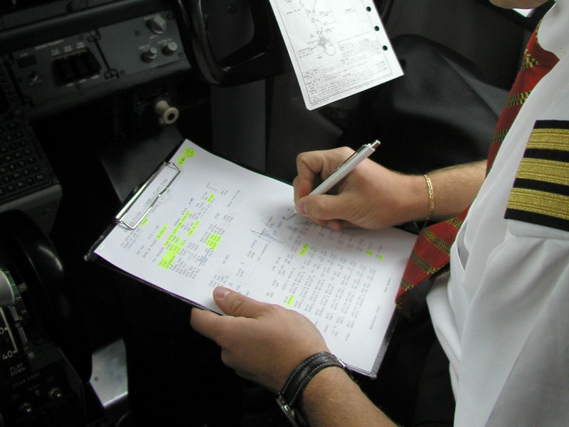 Der Erste Offizier hört sich das aktuelle ATIS (Wetterdienst auf einer bestimmten Frequenz) ab.