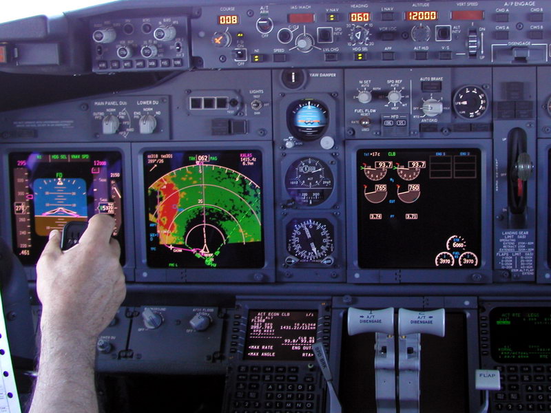 Schön durch das Echo des Wetterradars zu sehen die dichte Bewölkung vor uns und in rot die massiven